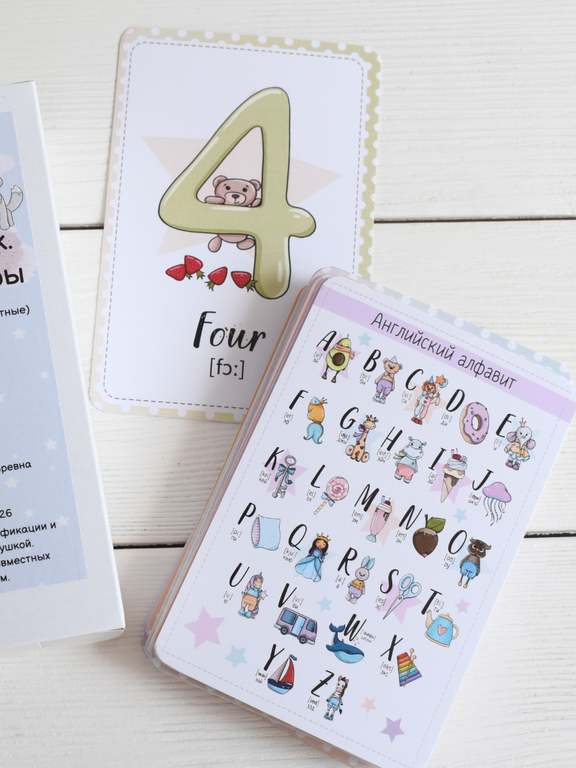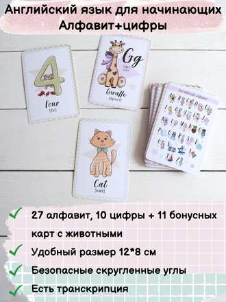 Набор карточек предназначен для начинающих изучать английский язык. Идеально подходит для совместных занятий взрослых с ребенком. Поможет ребенку легко и быстро, а главное, с удовольствием, выучить английский алфавит, цифры (от 1 до 10) и расширить словарный запас слов на английском языке.
