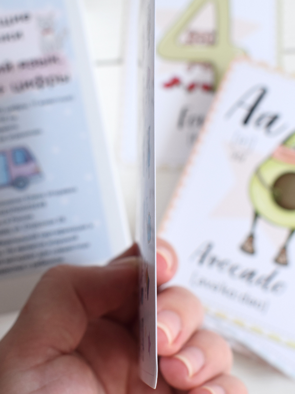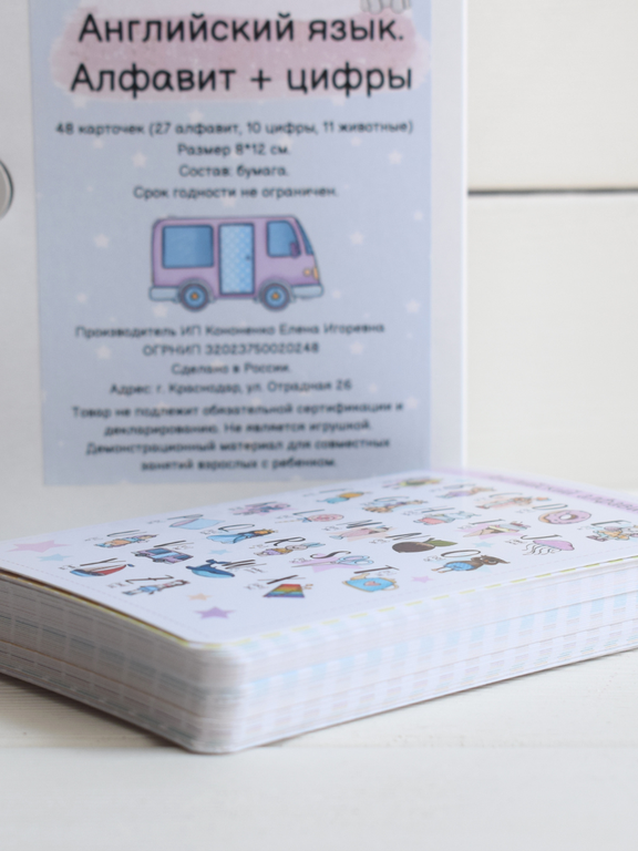 В комплекте 48 карточек: 27 алфавит, 10 цифры, 11 животные. Размер карточек 8*12 см, карточки односторонние с закругленными углами.