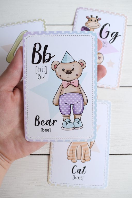 На каждой карточке есть название и транскрипция на английском языке, произношение на русском языке, а также красивая картинка с изображением животного или предмета, название которого начинается на соответствующую букву алфавита. Карточки удобно взять с собой в дорогу для занятий, а также подарить детям, которые хотят начать изучение английского языка.